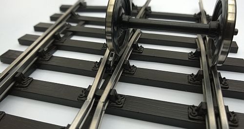 Please note - that the term 'Finescale' refers to the check chair gap set to 1.75mm and therefore 'Standard' wheel sets will not normally run through without riding up on the check rails, other than that 'Standard' gauge will run on the track. |